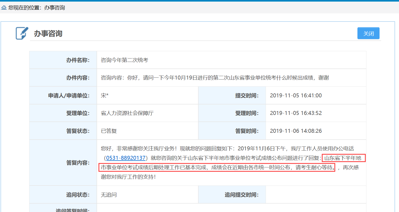 你好,请问一下今年10月19日进行的第二次山东省事业单位统考什么时候出成绩,谢谢